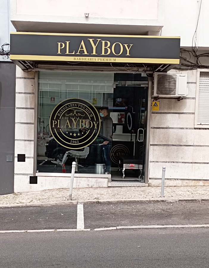 A barbearia PlayBoy decidiu confiar nos serviços do Grupo Effect para a decoração da montra do seu estabelecimento com utilização de vinil autocolante para vidros.