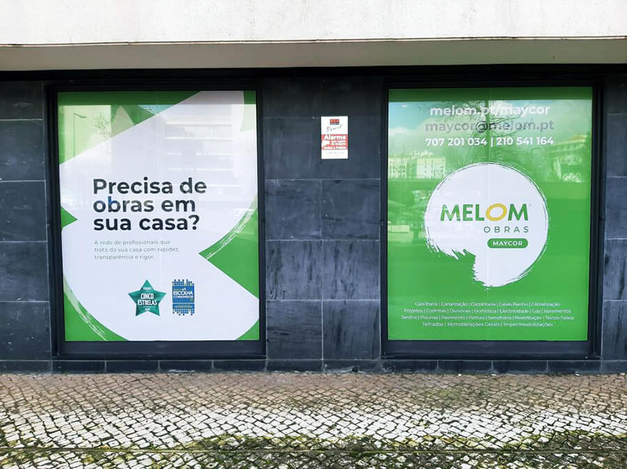 O Vinil Microperfurado foi o material considerado para esta decoração de montra pois a MELOM dá imensa importância à entrada de luz natural no seu estabelecimento, mas existem muitos outros tipos de vinil autocolante para montras que possam ser mais adequados ao seu projeto, pode consultar os mesmos e suas caracteristicas no nosso artigo Tudo Sobre Vinil!